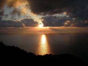 Questa immagine che ho scattato quattro anni fa tenta un’impossibile intreccio con i versi di Montale. E’ stata scattata in Liguria, nella località detta Punta della Madonna, dalle parti di Bonassola. Mostra definiti raggi di luce che uniscono la superficie del mare al tetto delle nuvole e alcune gradazioni di colore, come il rame del cielo e lo scurirsi del mare all’imbrunire, che rievocano le immagini scolpite da Montale. Non si ascoltano suoni, né quelli provocati dal vento di maestrale né il fragore delle onde: il suono per noi è quello di questi versi. Quanto al cuore, neppure quello montaliano vibra di una sua voce.