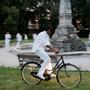 Vi immaginate di esser guidati attraverso gli anfratti di un’elegante giardino ottocentesco da due…”folletti” biancovestiti, e condotti sull’orlo delle scene del Romeo e Giulietta Shakespeariano tanto da poterci quasi infilare un piede dentro, e creder d’esser lì? E quando siete ormai assorti nel dialogo, presi dall’emozione di trovarvi proprio dentro la tragedia, commossi e incantati dalla luce che fa brillare gli abiti tutti bianchi nella luce crepuscolare già quasi notte, vi immaginate che il tintinnio di un campanello vi risvegli e vi guidi (dài!) alla scena seguente dove, che ne so, sulla soglia di una grotta di pietra Romeo discute animatamente col frate Lorenzo? Oppure tra le foglie del bosco, dove la balia si dispera per la morte di Tebaldo, mentre sullo sfondo Romeo, bandito, pedala verso il suo esilio? O ancora in un angolo più oscuro che ospita l’alcova ultimo luogo d’incontro degli innamorati da vivi? Ve lo immaginate?