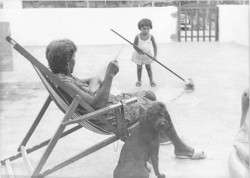 Nella foto ci siamo noi tre, la nonna che si fa aria col ventaglio, io duenne già in preda alla foga dei lavori domestici e Pucci, che è l’unico a guardare nell’obiettivo.
