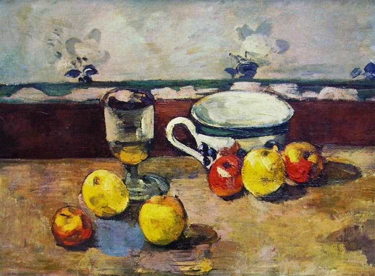 … Cézanne (…) sapeva trasformare una tazza da té in un essere animato, o meglio sapeva riconoscere l’essere in quella tazza. Cézanne porta la “natura morta” a un’altezza in cui le cose esteriormente morte diventano interiormente vive. Le tratta come tratta l’uomo, perché ovunque sa vedere la vita interiore. Dà loro un’espressione cromatica, cioè una dimensione intimamente pittorica, e le chiude in una forma traducibile in forme astratte, spesso matematiche, che diffondono armonia. Non rappresenta un uomo, una mela, un albero, ma usa questo materiale per formare qualcosa di intimamente pittorico che si chiama immagine.