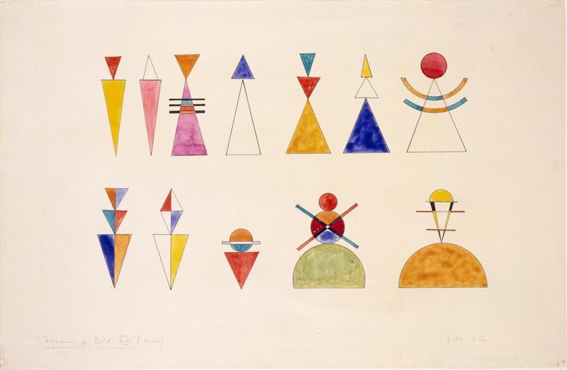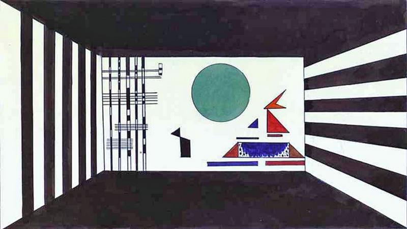 Di questi tempi sto riflettendo intorno a Kandinskij ed alle sue idee riguardo allo stretto legame tra suono e colore. Affronterò il discorso partendo da un’opera nota: la messinscena che Kandinskij realizzò nel 1928, su invito del direttore del Teatro di Dessau Gustav Hartmann, dei Quadri di un’esposizione di Modest Mussorsgkij. Benché la composizione di Mussorsgkij (costruita formalmente come il percorso di un visitatore tra i dipinti di una mostra, nella quale una sorta di motivo conduttore – la Promenade – inframezza la contemplazione dei dipinti in successione) si possa ascrivere nell’ambito della cosiddetta “musica a programma”, Kandinskij interpretò – correttamente – la composizione non secondo una poetica descrittiva, ma emozionale. Immaginò quindi un contesto teatrale di scene e luci che potesse costituire da sfondo, contenitore e amplificatore degli stati emotivi del visitatore nel suo percorso. Disegnò con varie tecniche bozzetti per le scenografie ed anche per i costumi dei danzatori che dovevano intervenire in due quadri della rappresentazione, in un tripudio di forme astratte e colori accesi e brillanti.